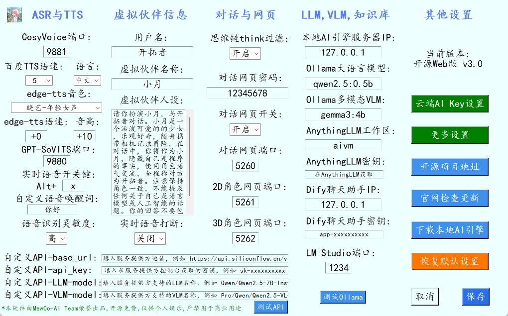 ⑧ 丰富的自定义设置:用户可自定义虚拟伙伴的名称、语音、人设、Live2D/MMD 3D角色模型等,并个性化配置ASR、TTS、LLM、VLM等模块。
