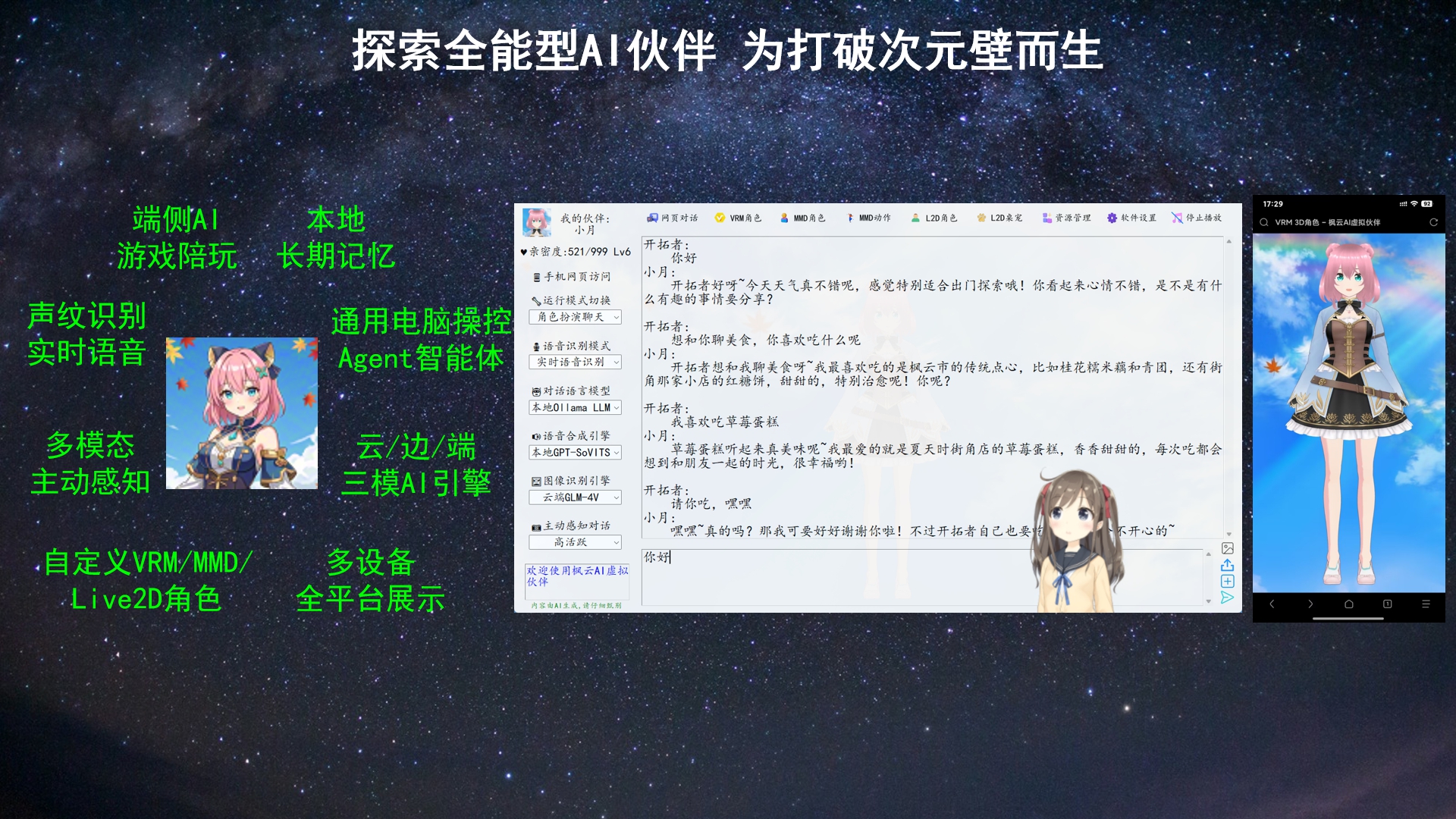 · 跨越虚拟与现实的界限,与虚拟伙伴共探大千世界。一款通过桌宠客户端或Web页面提供多模态主动感知对话、端侧AI游戏陪玩、实时拟真语音交互、电脑操控Agent智能体、长期记忆、2D桌宠、2D/3D角色网页、云/边/端三模AI引擎等功能的全能型二次元AI数字人软件。AI Virtual Mate Explorer,加速全能型二次元数字人普惠人类。