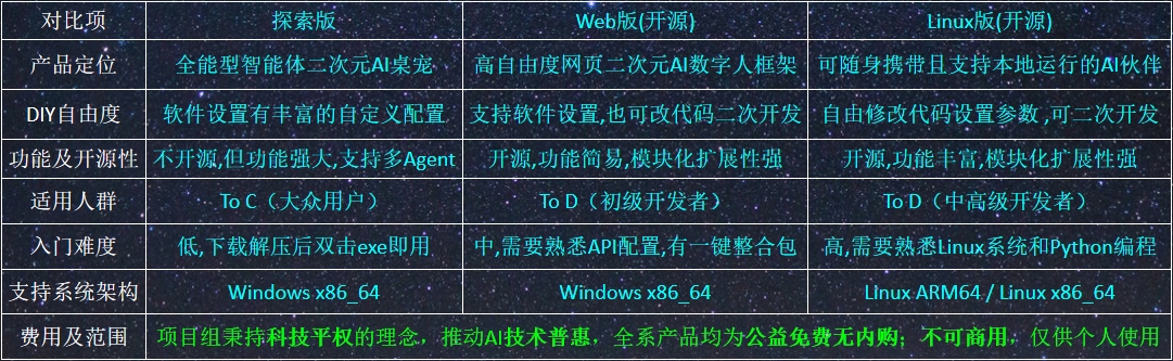 · 目前已推出的产品:枫云AI虚拟伙伴探索版、枫云AI虚拟伙伴Web版(开源)、枫云AI虚拟伙伴Linux版(开源)